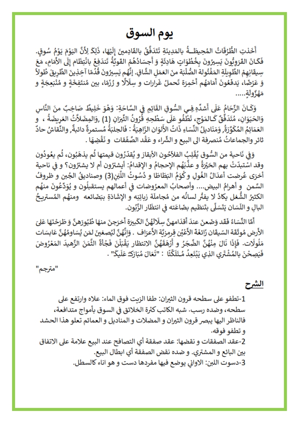 وَكَــــــانَ الزِّحَامُ عَلَى أَشدِّهِ ِفِــــــي السُّوقِ القَائِمِ فِي السَّاحَةِ: وَهْوَ خَلِيطٌ صَاخِبٌ منَ النَّاسِ وَالحَيَوَانِ، مُتَدَفِّقٌ كَــــــالمَوْجِ، تَطْفُو عَلَى سَطْحِهِ قُرُونُ الثِّيرَانِ (1) ,وَالمِضَلاَّتُ العَرِيضَةُ ، و العَمَائِمُ المُكَوَّرَةُ, وَمَنَاديلُ النِّسَاءِ ذَاتُ الأَلوَان الزّاهِيَةُ : فَالجلبَةُ مُستمرةٌ دائبةٌ, والنِّقاشُ حادٌ ثائر والجماعاتُ مُنصرفة الى البيع و الشِّراء و عَقْد الصَّفَقات و نَقْضِهَا .