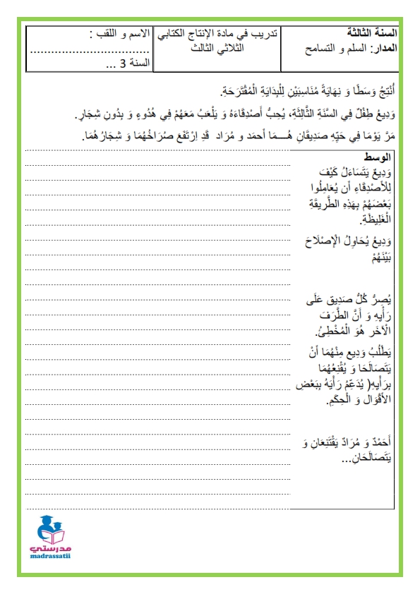 تدريب-في-مادة-الإنتاج-الكتابي-السنة-الثالثة-السلم-و-التسامح-madrassatii-com