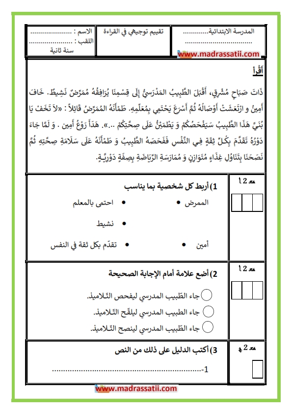 تقييم توجيهي في مادة القراءة – السنة الثانية