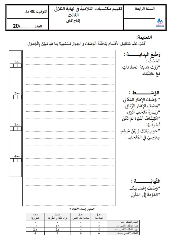 تقييم مكتسبات التلاميذ انتاج كتابي الثلاثي الثالث السنة الرابعة