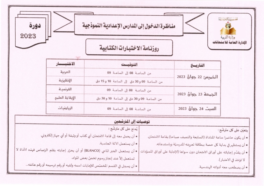 مناظرة الدخول إلى المدارس الإعدادية النموذجية – روزنامة الاختبارات الكتابية (دورة 2023)_001