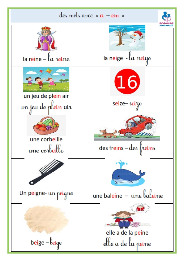 des mots avec ei ein avec exercice d'ecriture madrassatii.com