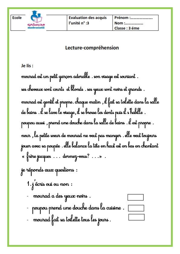 evaluation des acquis de l'unité 3 - 3ème année français  madrassatii.com